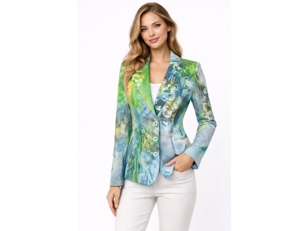 Sako DEBRA - stylové dámské sako, které okamžitě upoutá svým jedinečným barevným potiskem v odstínech zelené, modré a jemných světlých tónů. Díky vypasovanému střihu krásně zvýrazní siluetu a dodá outfitu ženskost i eleganci.