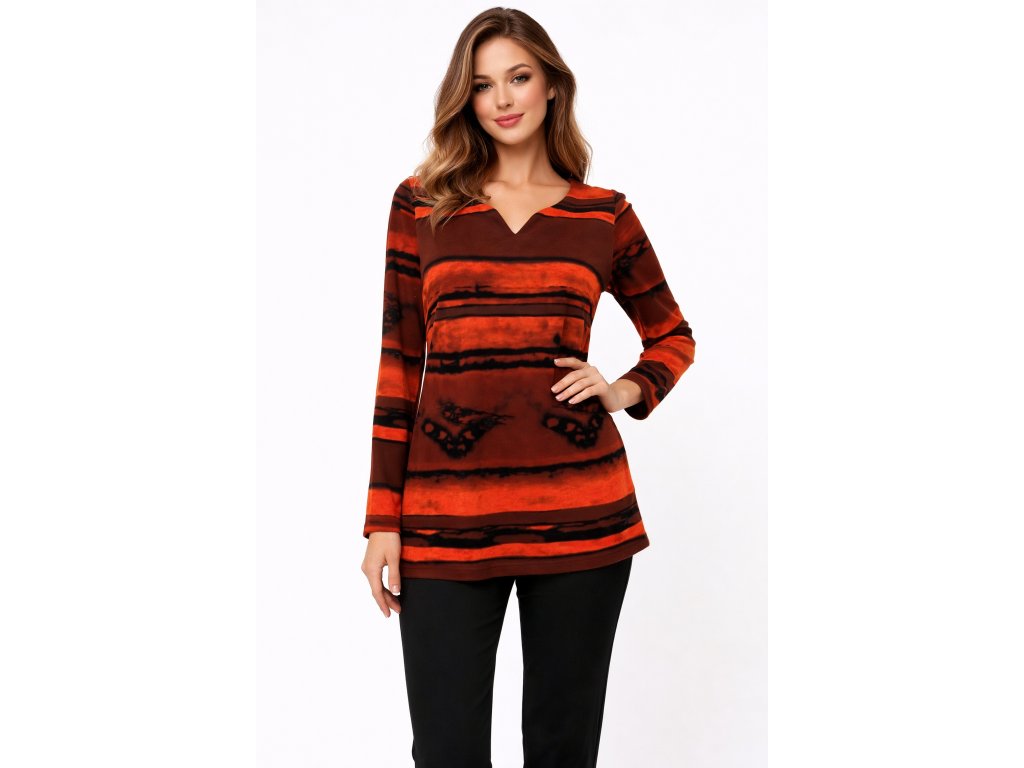 Tunika SAMKA - stylová tunika v teplých tónech hnědé a cihlové barvy zaujme originálním vzorem a nadčasovým střihem. Jemně projmutá silueta lichotí postavě. Dlouhé rukávy a pohodlná délka z ní dělají ideální kousek pro každodenní nošení i elegantnější příležitosti.